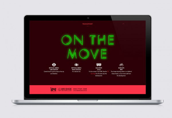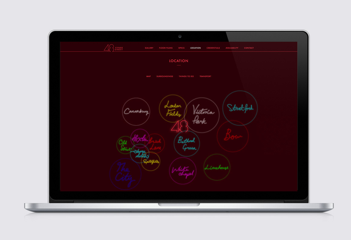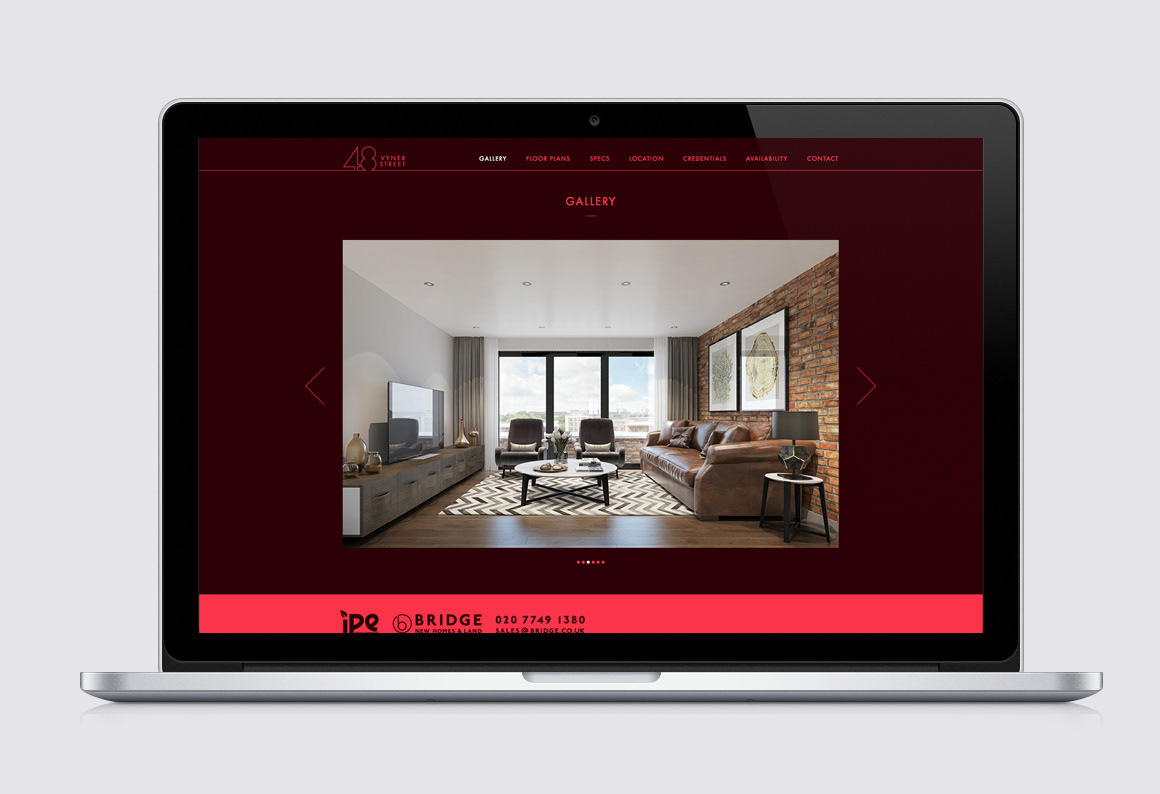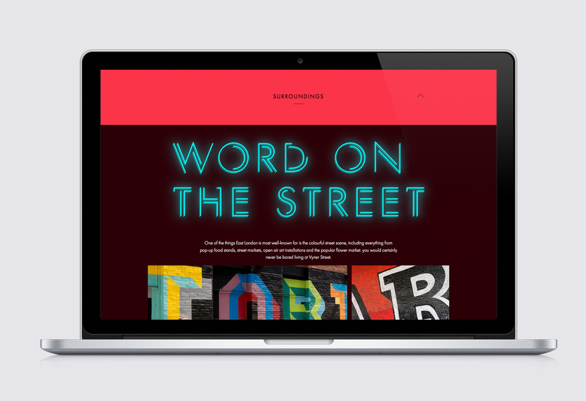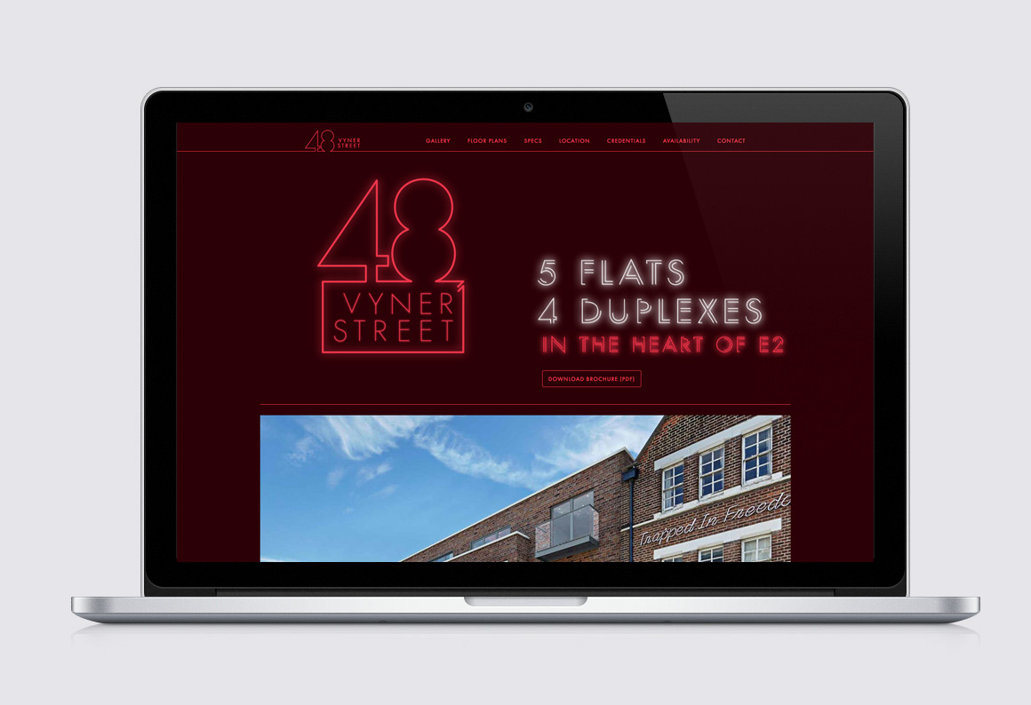 Bespoke typography, branding and website design for a new property development on Vyner Street in Hackney. Work completed at Energy Design Studio.