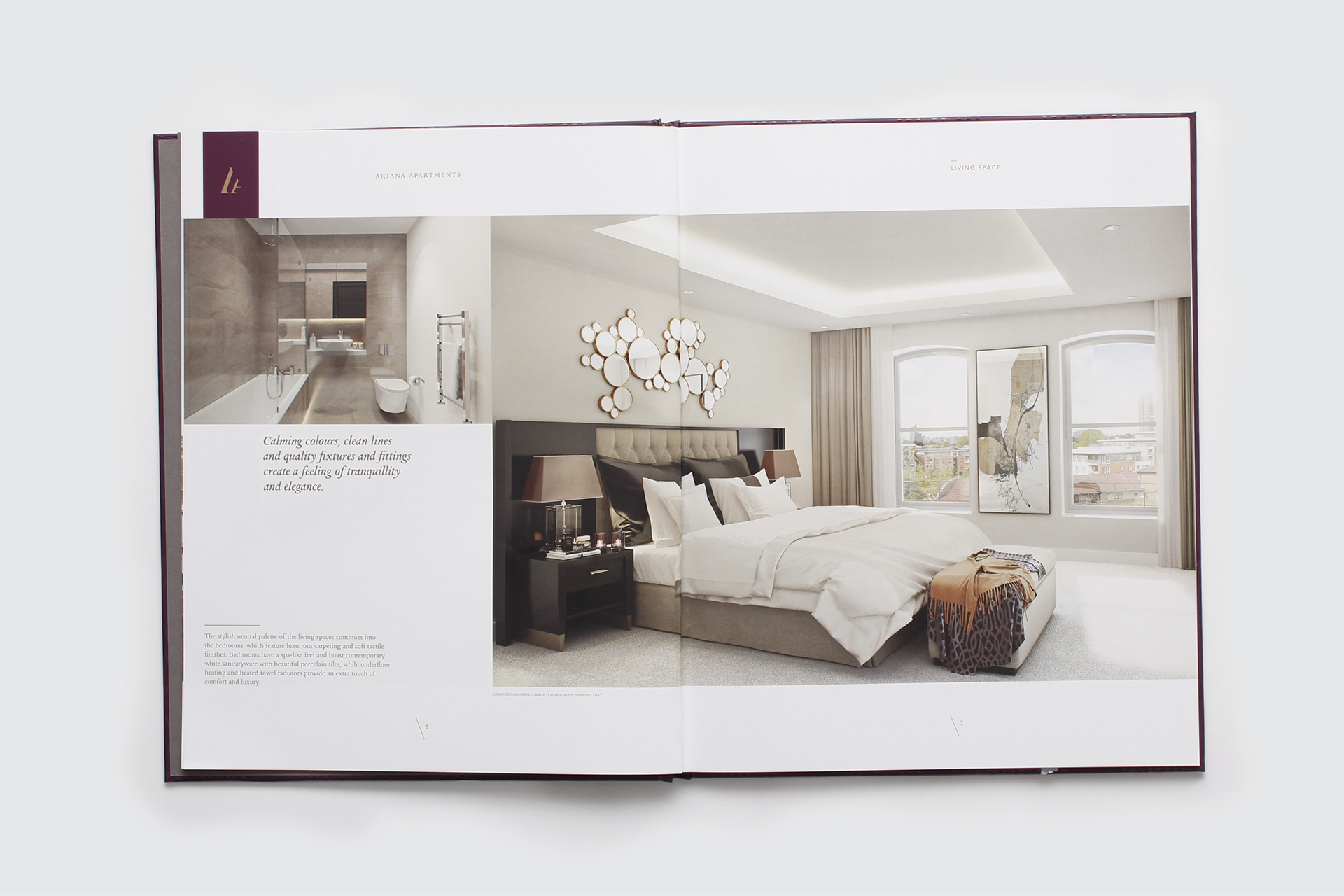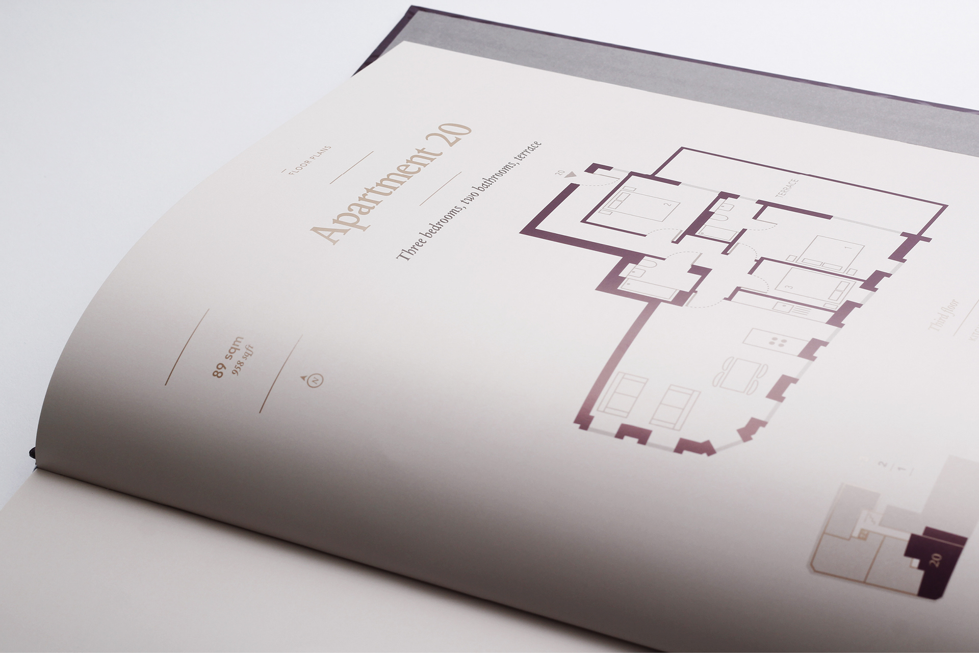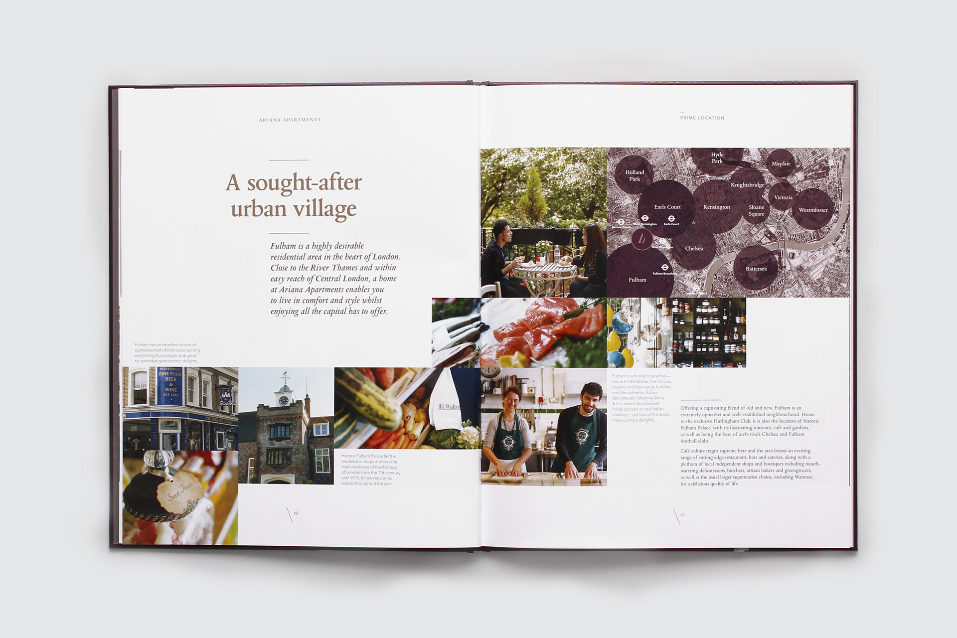 Brochure for a luxury property development in Fulham. The brochure is case bound and printed in 6 colour including a metallic ink with copper foiling detail and spot varnish finishes to the cover. Work completed at Energy Design Studio.