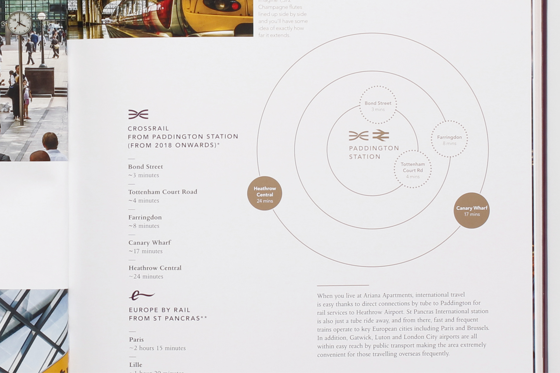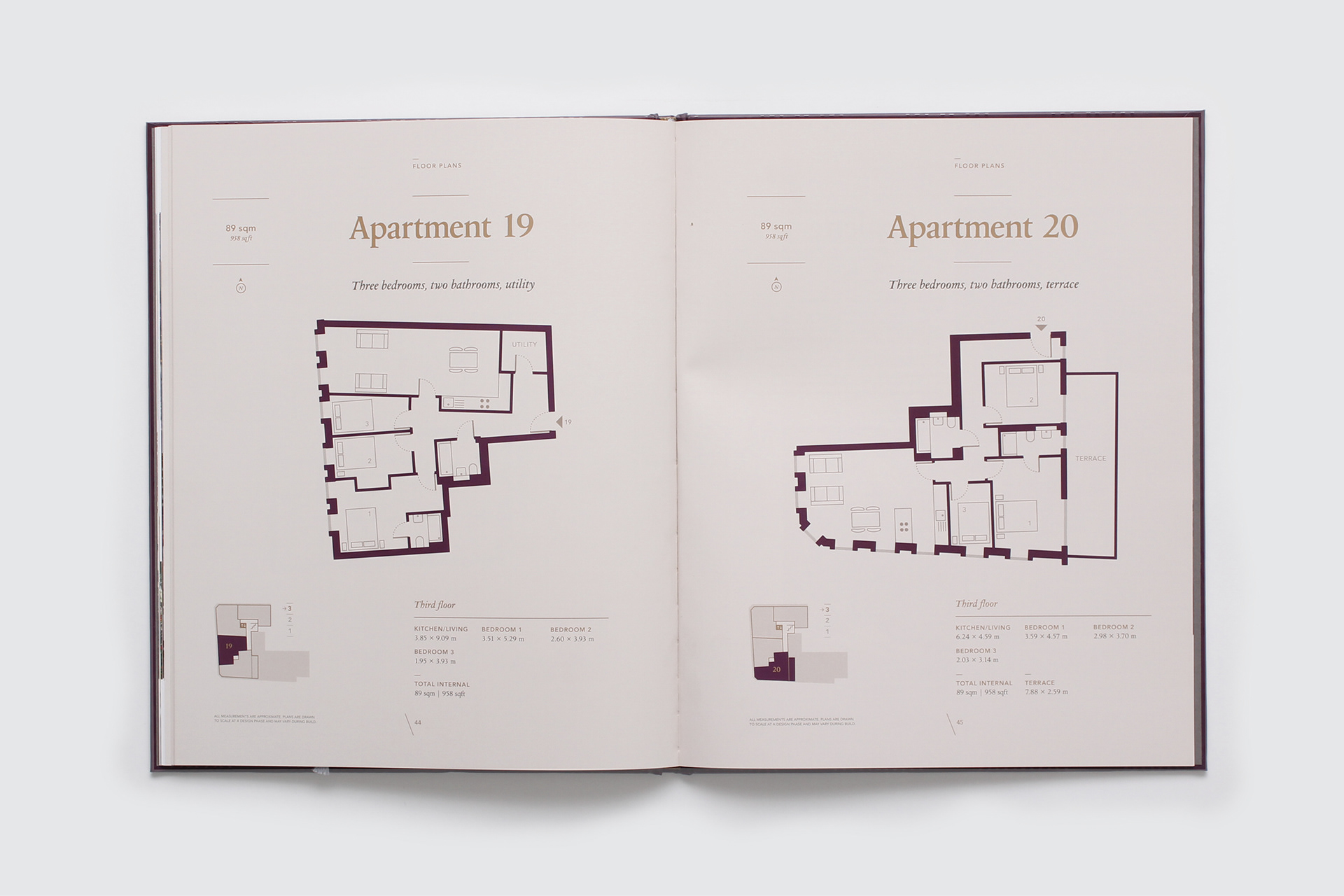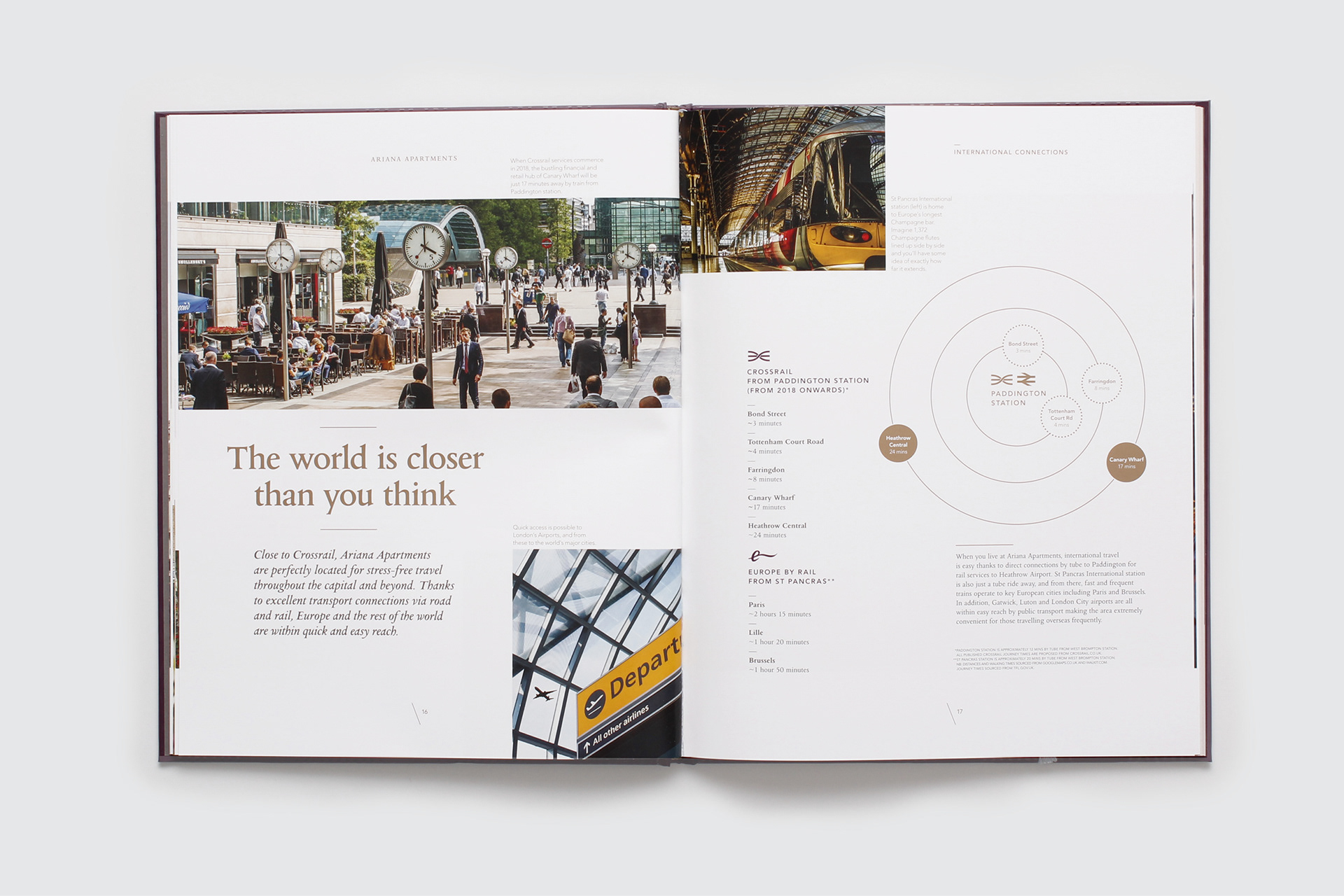 Brochure for a luxury property development in Fulham. The brochure is case bound and printed in 6 colour including a metallic ink with copper foiling detail and spot varnish finishes to the cover. Work completed at Energy Design Studio.