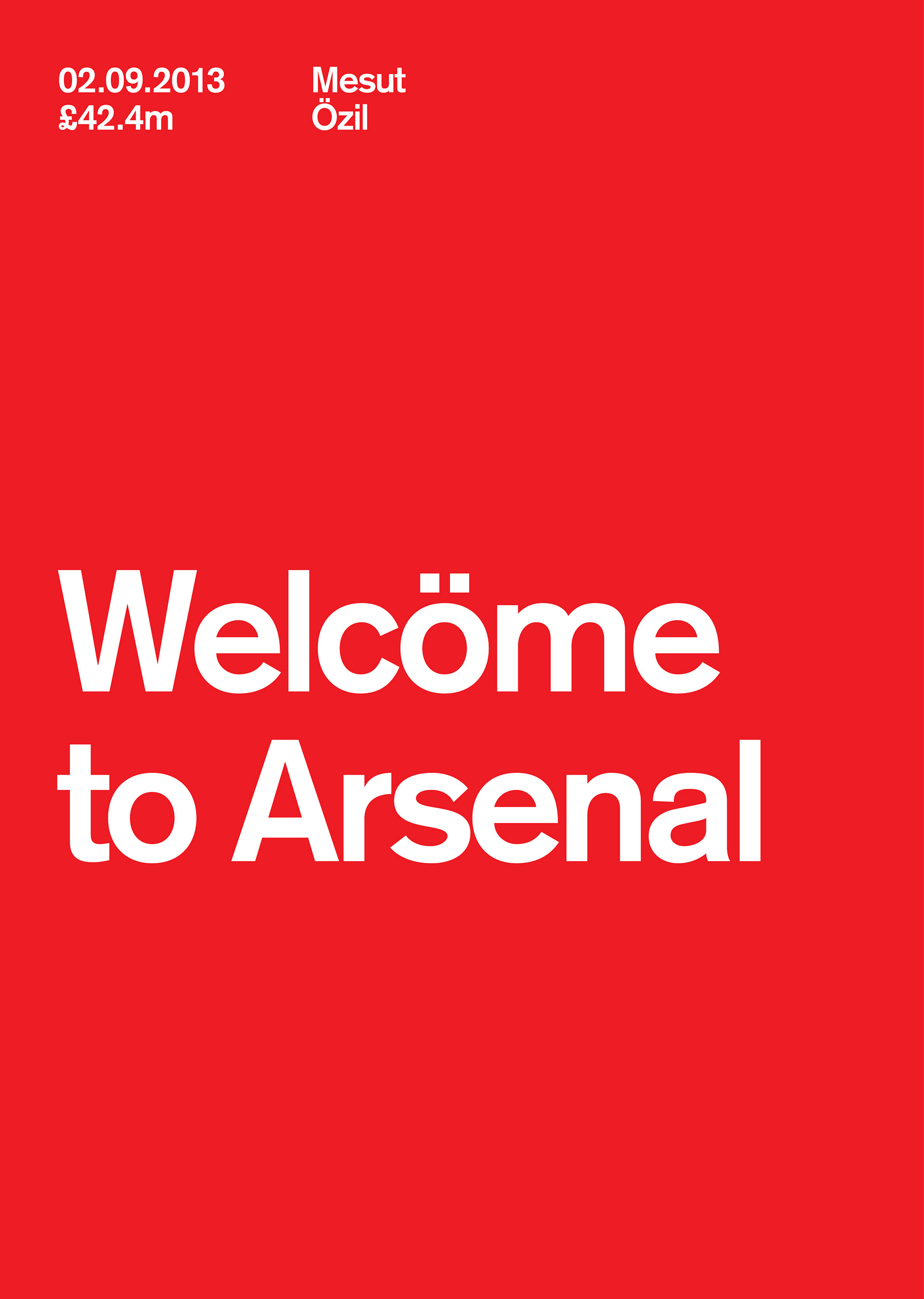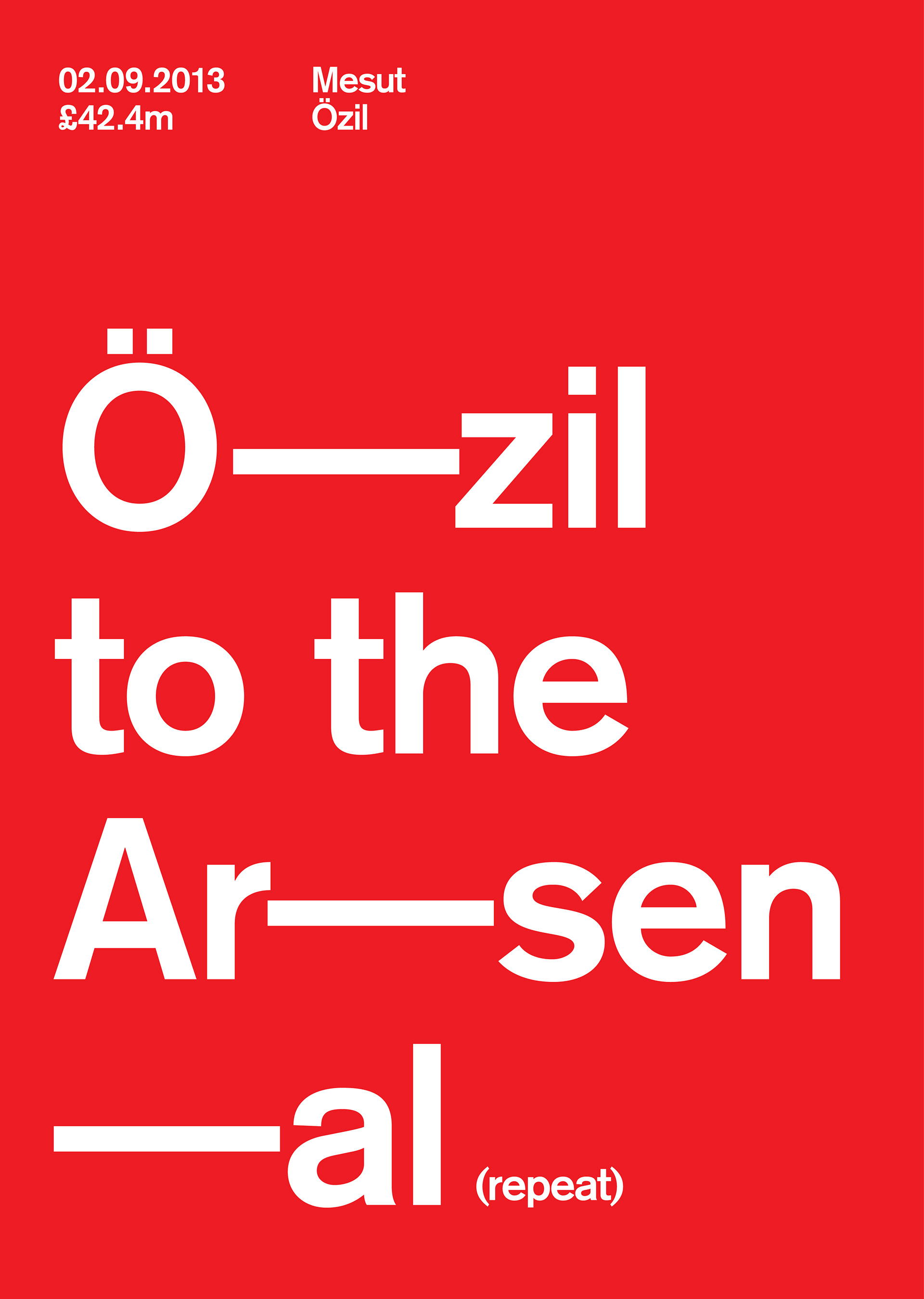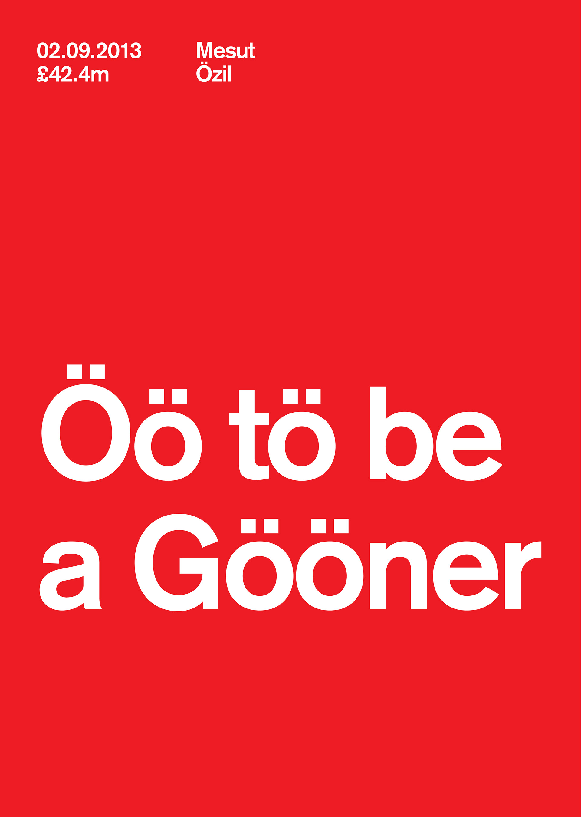 Series of posters celebrating Arsenal's record breaking transfer of Mesut Özil from Real Madrid at the end of the summer transfer window in 2013. Typographically playing on a theme of popular supporter chants and the umlaut in Özil.