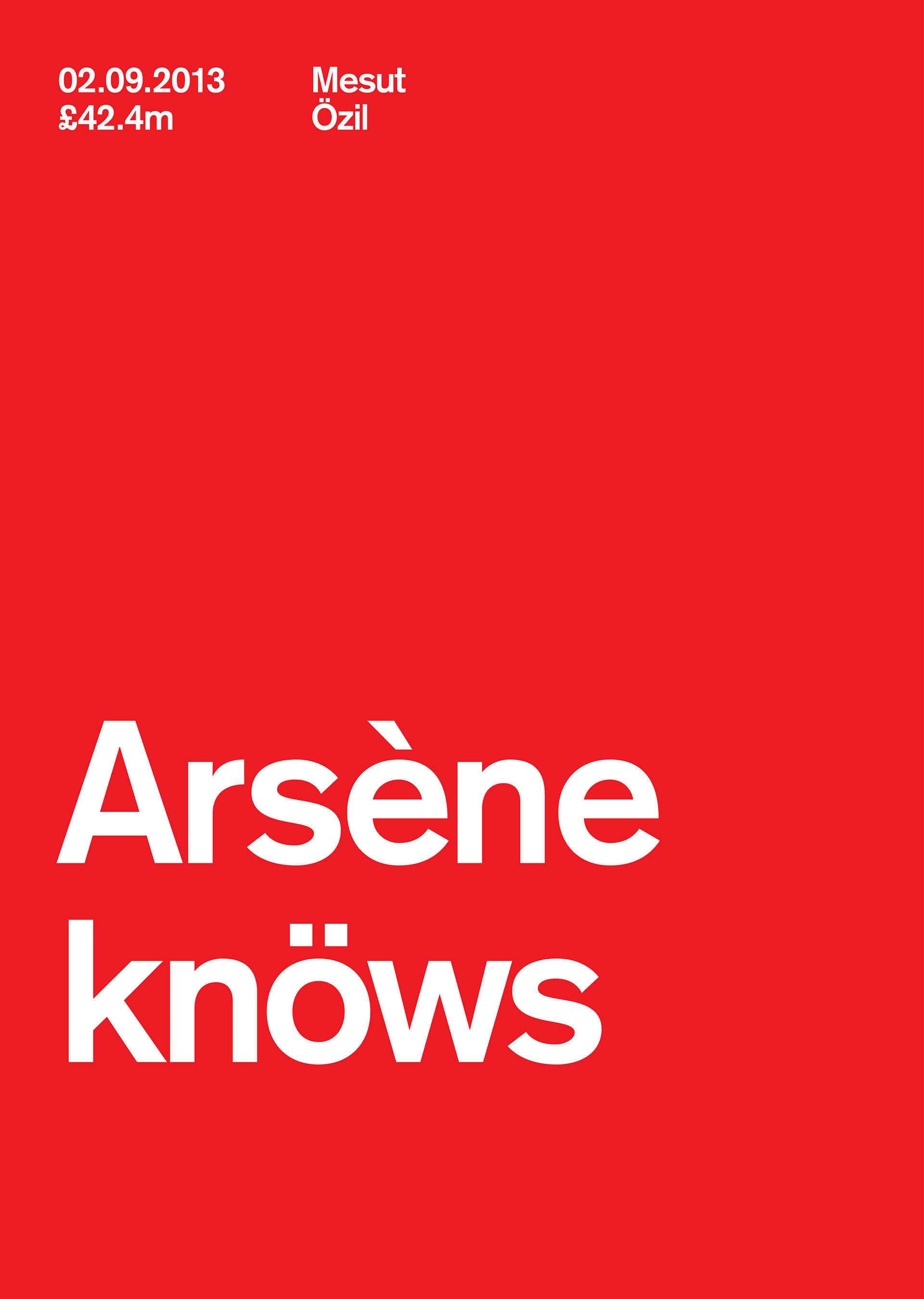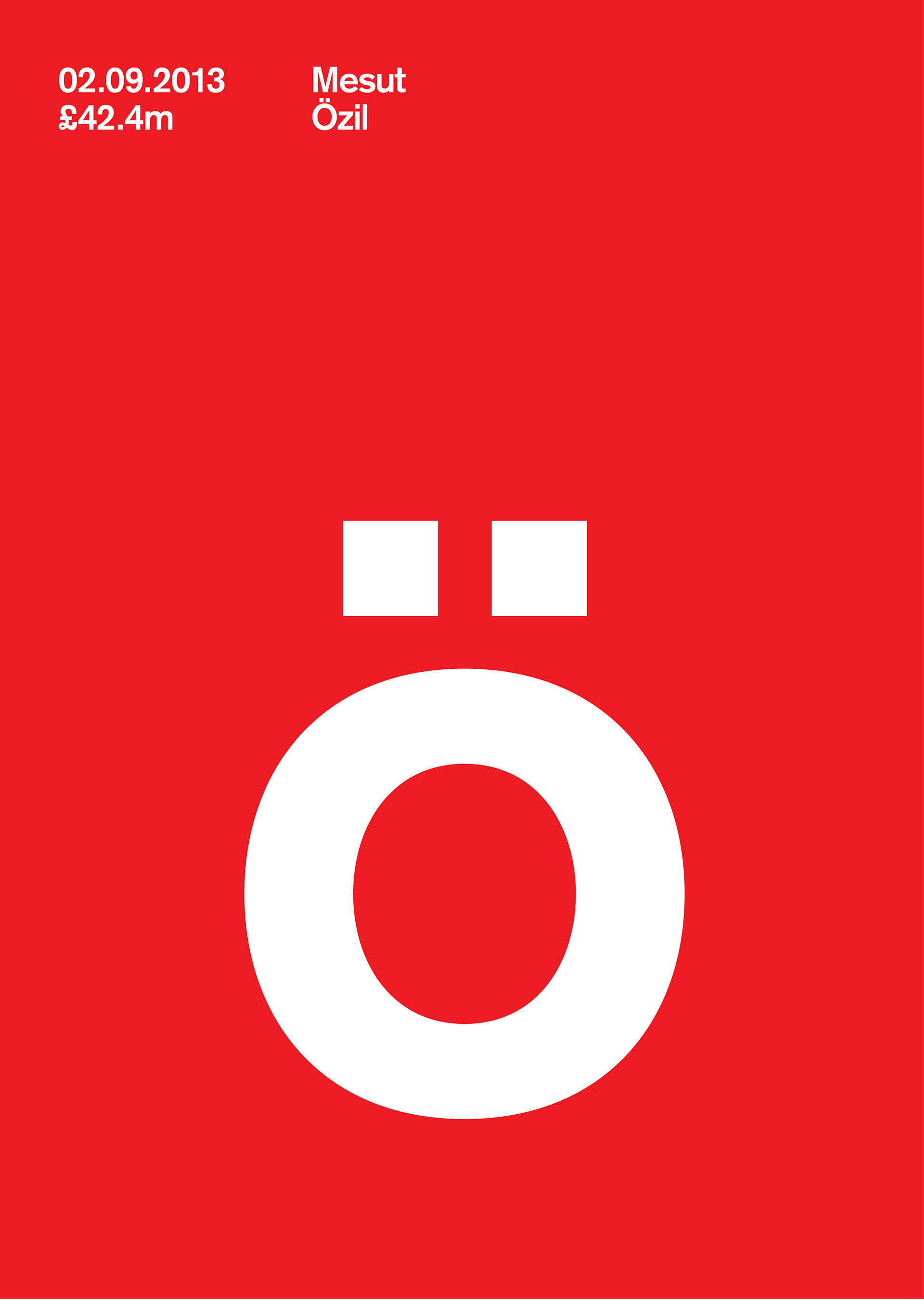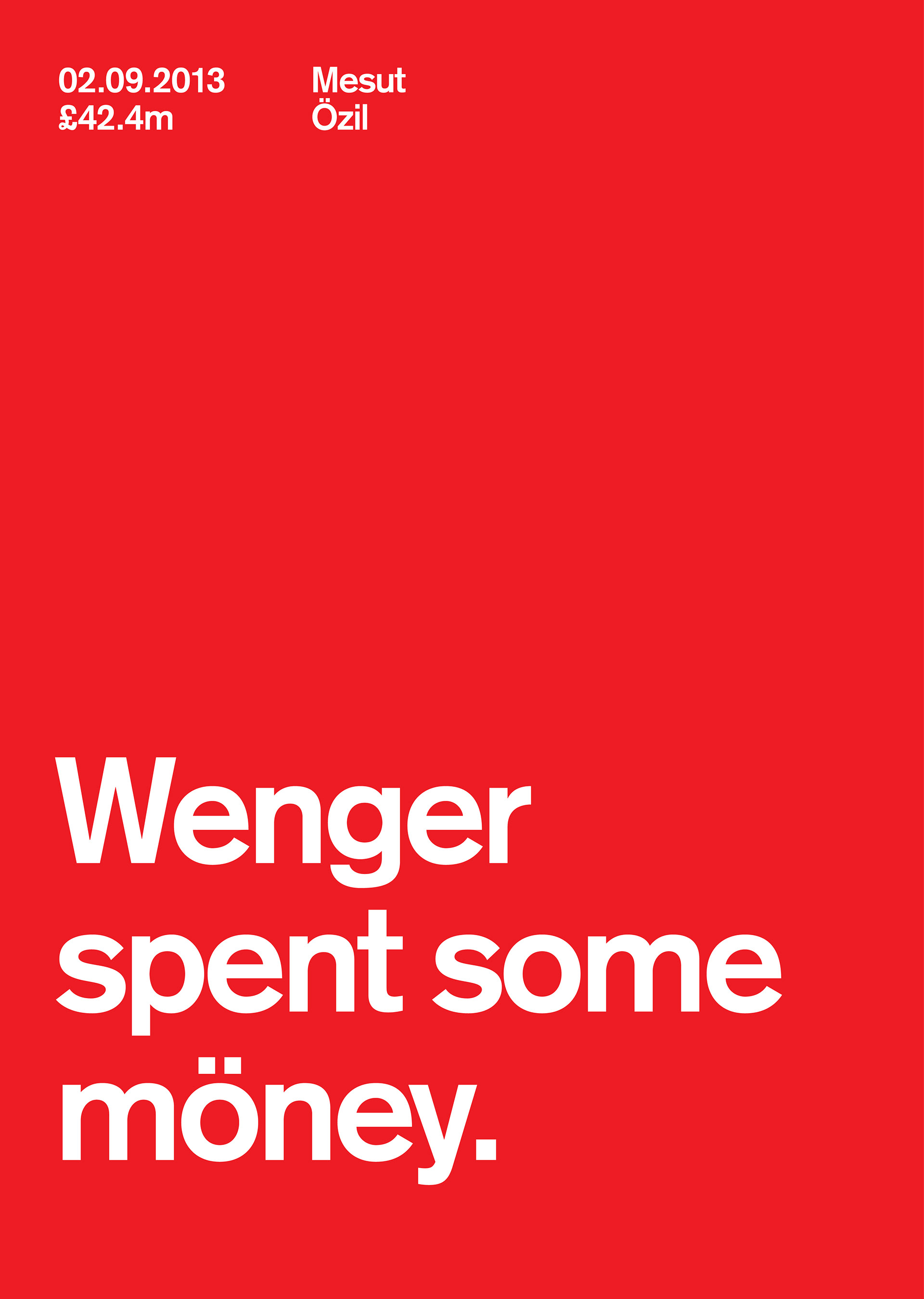 Series of posters celebrating Arsenal's record breaking transfer of Mesut Özil from Real Madrid at the end of the summer transfer window in 2013. Typographically playing on a theme of popular supporter chants and the umlaut in Özil.